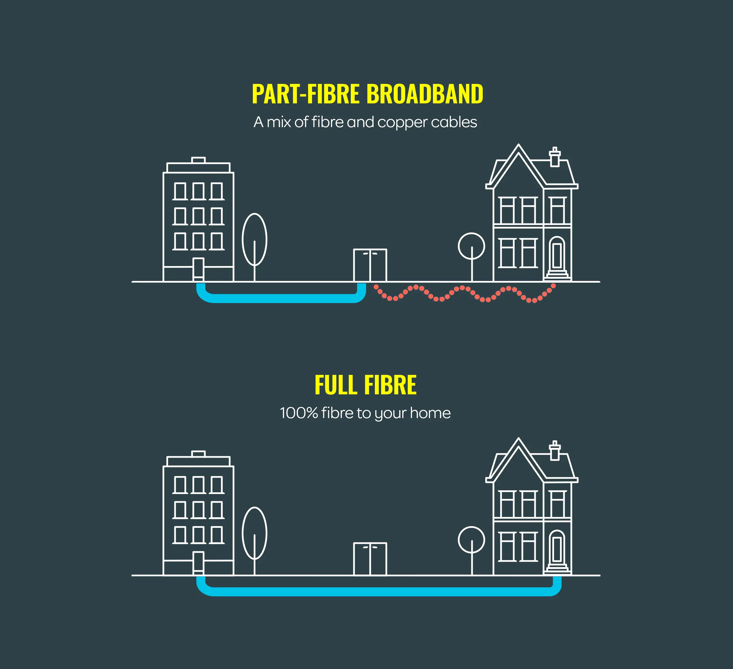 Part-fibre, or FTTC (Fibre to the Cabinet), blends fibre optic speed with copper cable reach. Fibre runs to a street cabinet near your home, then copper takes over for the final stretch.